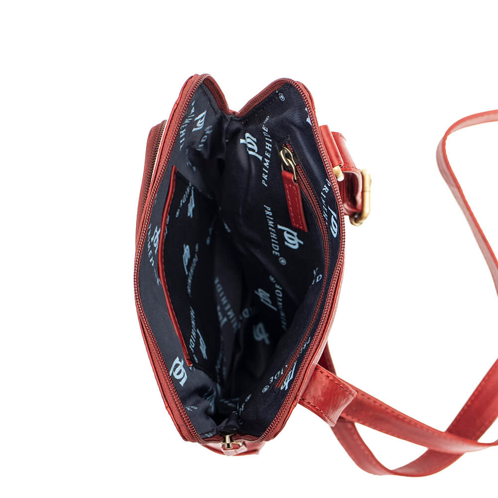 The front has a zip-around pocket that's really handy for things you need to grab quickly, phone, travel card, whatever. The main compartment zips open to keep everything secure, and inside there's a zipped pocket and a pouch pocket for keeping smaller bits organised. The leather shoulder strap adjusts to however you like wearing it, crossbody or over the shoulder.