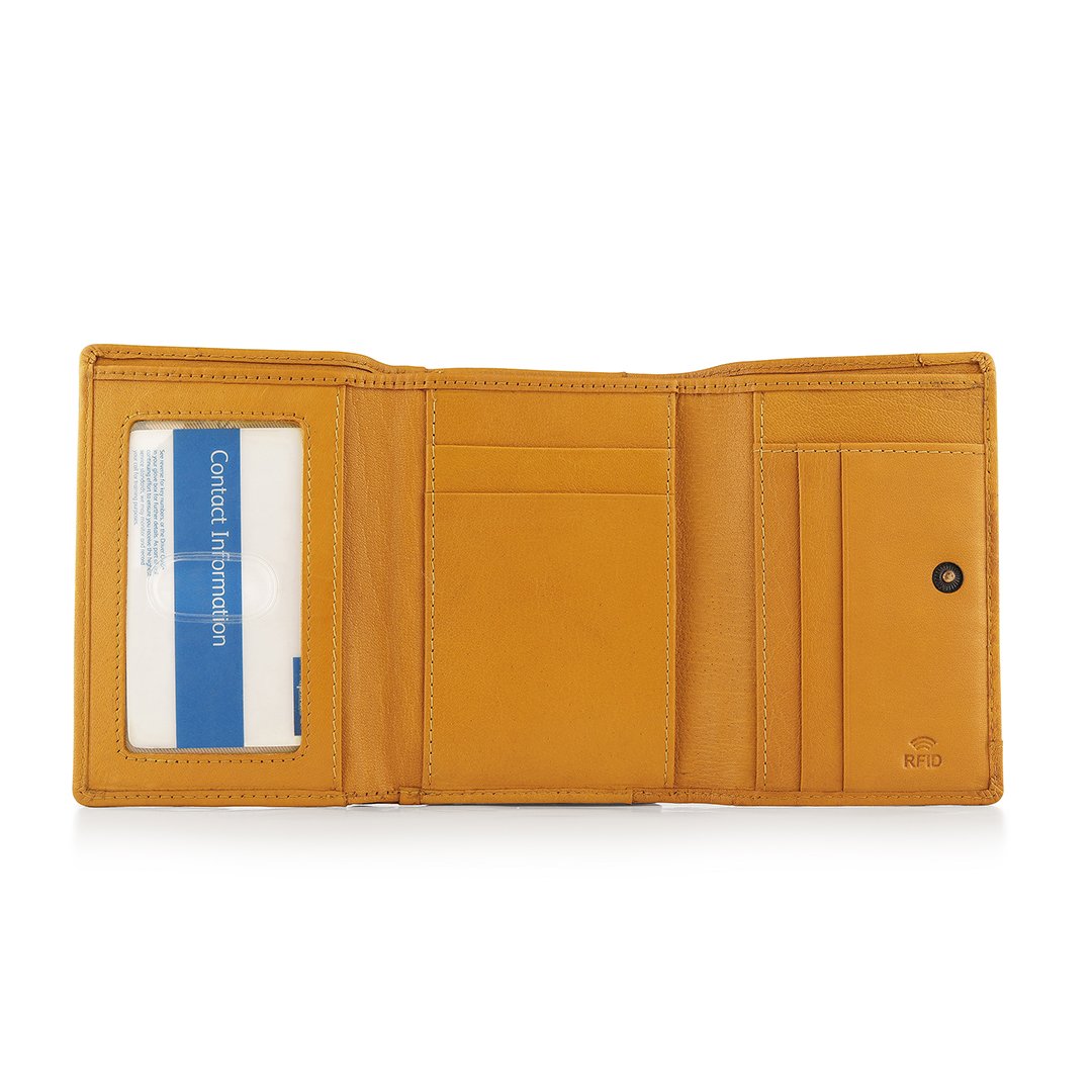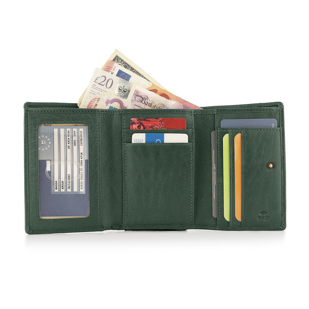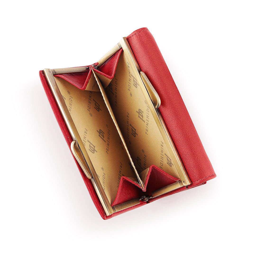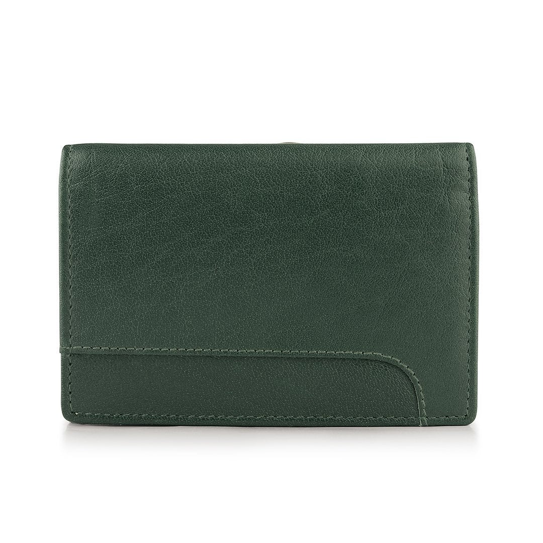 The Velura Clip Frame Trifold Purse is a sophisticated Genuine Leather wallet designed with RFID security to protect your cards. This purse features 5 Credit Card Slots, Additional Slip Pockets, an ID Window, and a spacious Note Section. The classic Clip Frame Coin Section adds both elegance and functionality, making this purse a stylish and secure choice for everyday use.