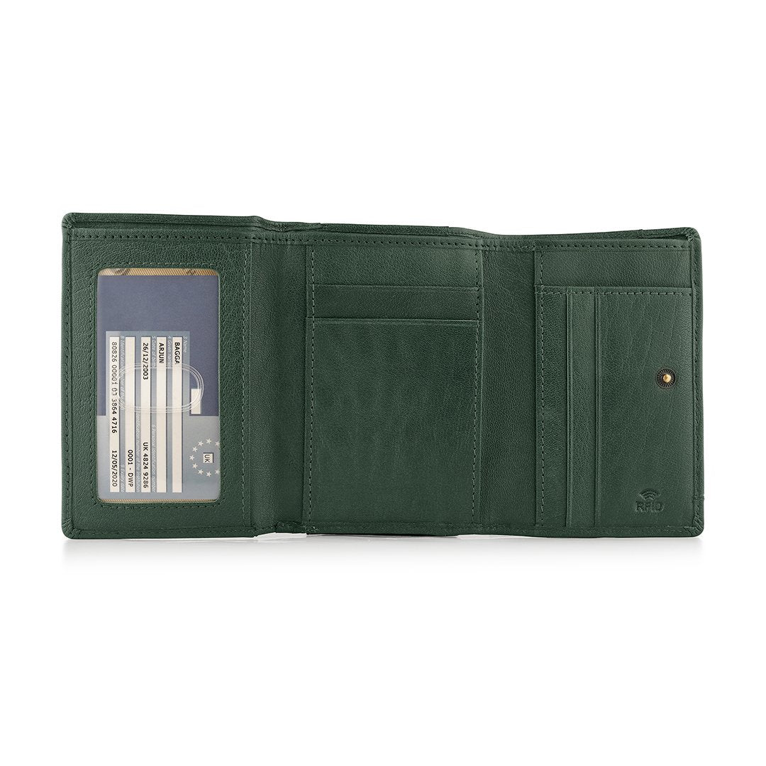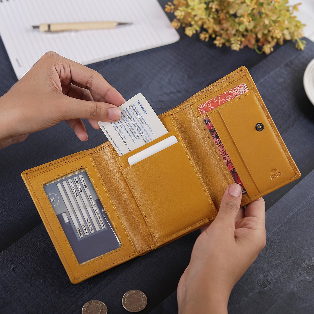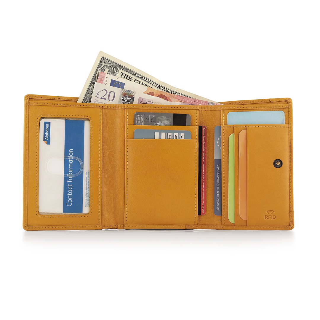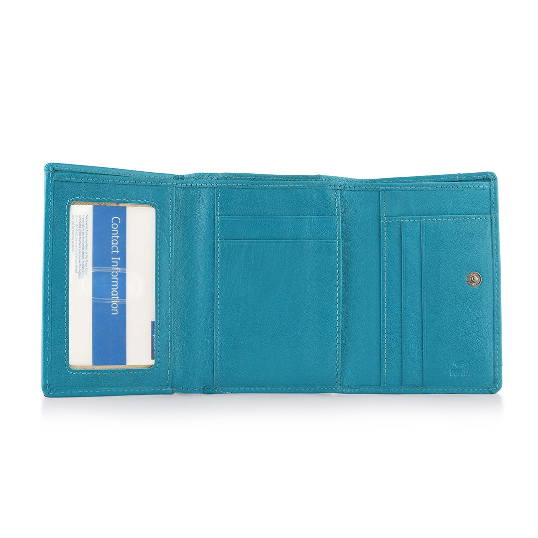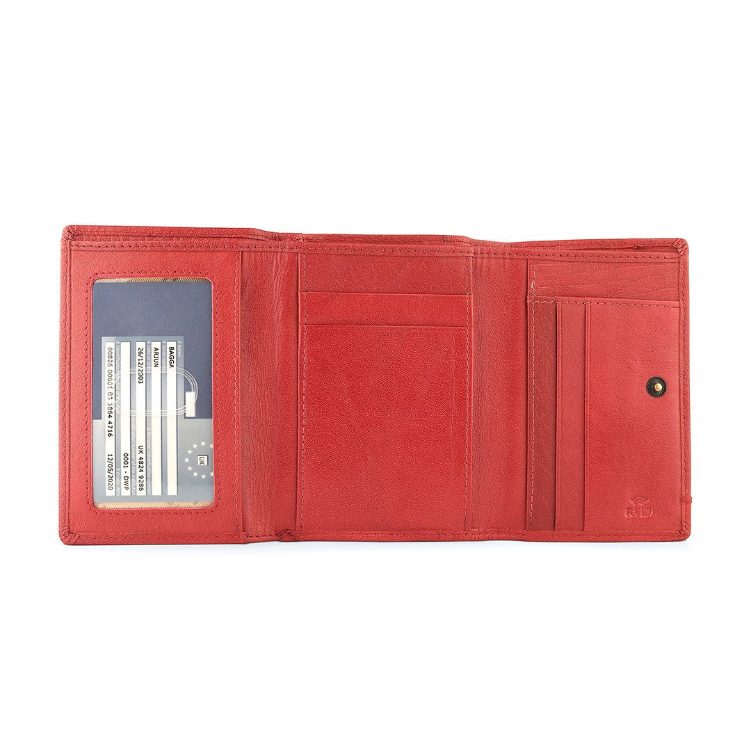 The Velura Clip Frame Trifold Purse is a sophisticated Genuine Leather wallet designed with RFID security to protect your cards. This purse features 5 Credit Card Slots, Additional Slip Pockets, an ID Window, and a spacious Note Section. The classic Clip Frame Coin Section adds both elegance and functionality, making this purse a stylish and secure choice for everyday use.